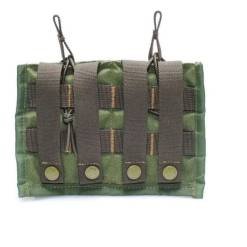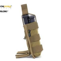 Confeccionado em Cordura® 1000 DENIER, elásticos de 3,5 mm de espessura e puxador em fita de 2,5cm 100% poliamida dobrada ao elástico como puxador do sistema de pressão sobre o(s) carregador(es).